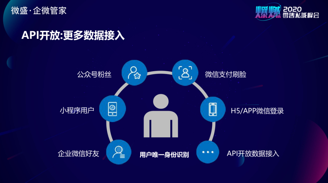 API开放,更多数据接入:同时企业微信还开放了很多的接口,我们可以把CRM的数据及客户在微信生态的其他数接入,基于ID来去识别客户统一身份。