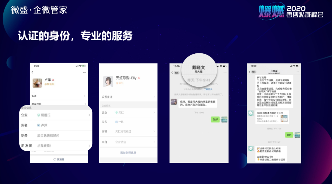 当我们用企业微信加顾客为好友的时候,企业微信的资料可以显示企业的品牌名或公司简称。这意味着“我”是被认证过的,身份可信赖。如屈臣氏、天虹、周大福等认证了企业微信,让员工用“认证过的身份”给客户提供服务。