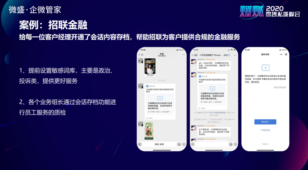 金融和银行保险等行业因为政策监管原因要求对接客户中要留记录。比如招联金融,使用企业微信服务客户过程中,通过会话内容合规存档功能,在告知用户的情况下,可以把互动的内容、客户的问题做一个全流程的留档。