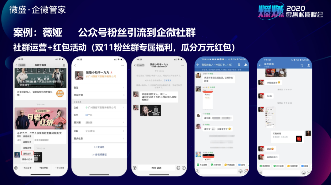 谦寻公司(薇娅的运营公司)把公众号上数百万链接和互动较弱的粉丝,引导添加企业微信好友或企业微信群,在粉丝群内提供福利和直播信息,也会用企微管家的红包功能给微信客户发红包。
