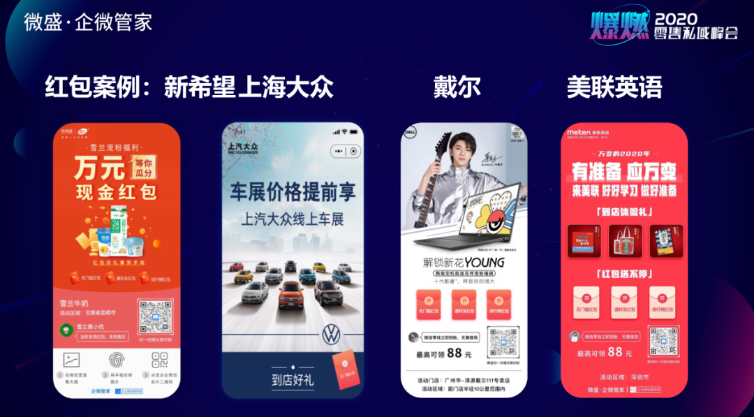 除了中小企业,像新希望、上海大众、戴尔、美联英语等头部企业,都在用企微管家的红包功能进行拉新和引流。