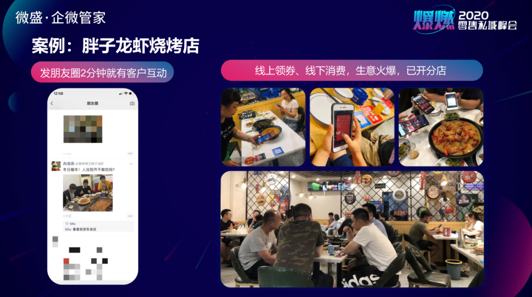 如,因疫情影响快要关店的一家龙虾店,他们在餐桌上放企业微信的二维码。客户扫码时可以领取红包或优惠券,用户邀请新客也可以领取红包,单个获客的红包成本只有几毛钱。我们通过一场营销获客的活动,加了8000多好友,数百人进店消费,带来了十几万消费。他们每天都会更新优惠,提醒客户去吃,通过重复的多次加客户裂变的方式,目前这家龙虾店生意火爆,已经开了新店。